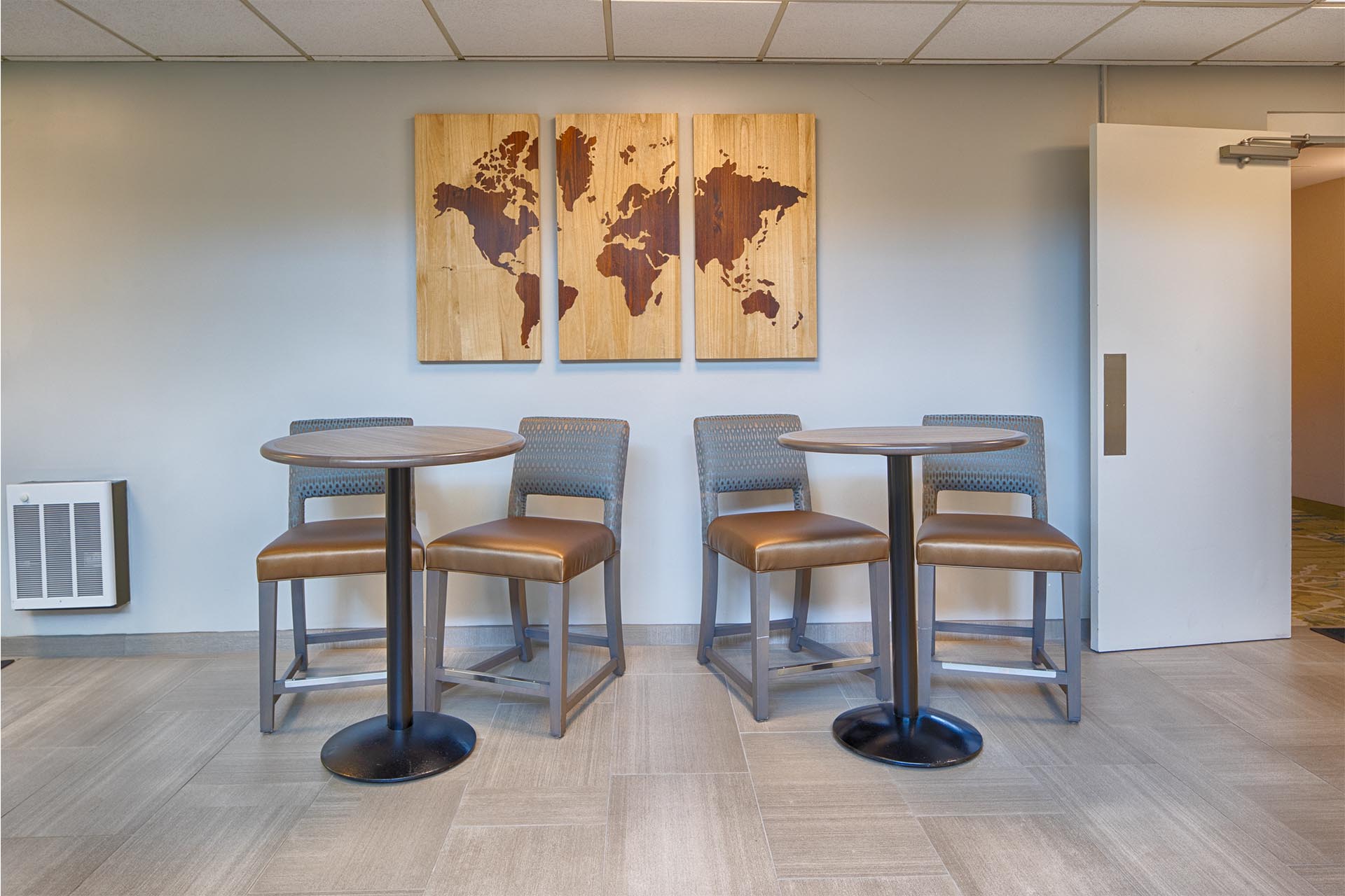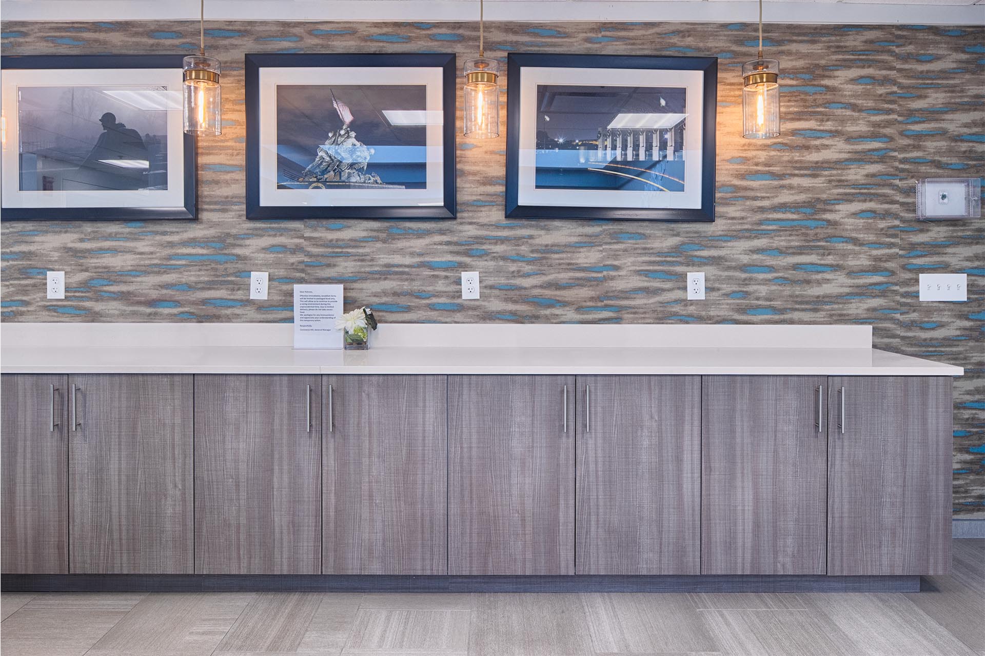 Key spaces such as sleeping rooms, lounges, offices, and mechanical rooms underwent mold abatement, selective demolition, and surface preparation. New metal stud walls, acoustical ceiling grids, gypsum ceilings, and flooring systems—including LVT, ceramic tile, and carpeting—were installed. Custom millwork for the front desk and coffee bar, new LED lighting, and emergency egress signage were also added.